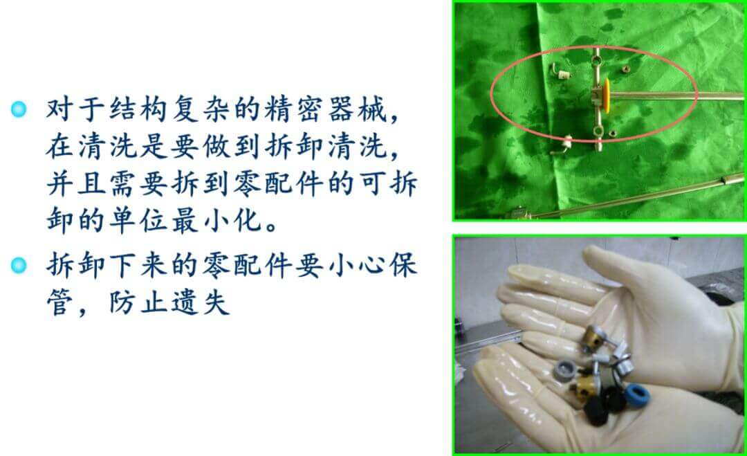 清洗前穿戴好護(hù)目鏡、雙層手套、防護(hù)服,器械打開(kāi)關(guān)節(jié),可手工拆的要進(jìn)行拆卸。